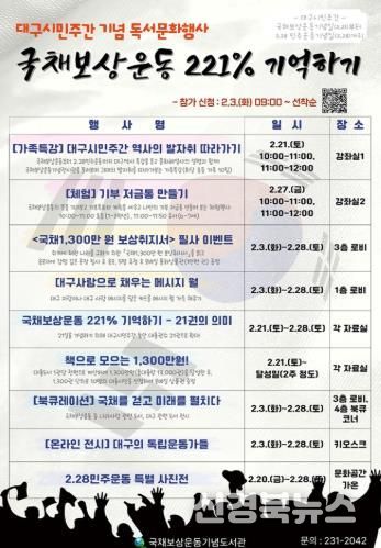 [신경북뉴스] 대구시교육청 산하 국채보상운동기념도서관은 대구시민주간(2월 21일 ~ 28일)을 맞아 대구사랑과 나라사랑의 의미를 되새기기 위한 대구시민주간 기념 행사를 운영한다.