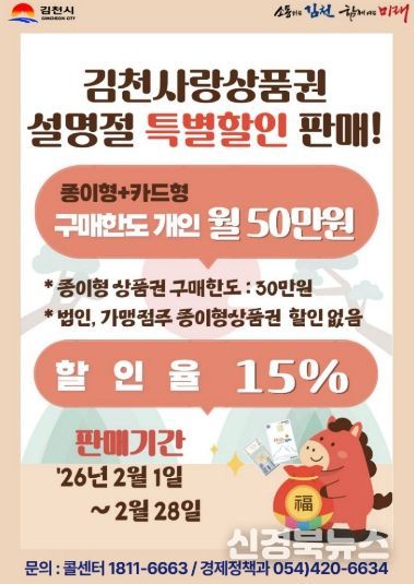 [신경북뉴스] 김천시는 오는 설 명절을 앞두고 2월 한달간 김천사랑상품권을 15% 특별 할인 판매하여 지역 소비 활성화에 나선다.