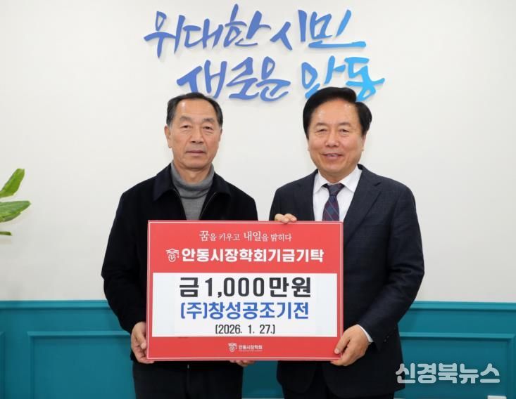 [신경북뉴스] 지역의 꿈나무들이 마음 놓고 공부할 수 있는 환경 조성과 인재 양성을 위해 노력하고 있는 (재)안동시장학회는 ㈜창성공조기전 천성용 대표가 1월 27일 안동시청 시장실을 방문해 장학기금 1천만 원을 기탁했다고 밝혔다.