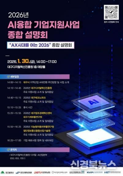 [신경북뉴스] 대구광역시는 1월 30일 오후 2시, 대구디지털혁신진흥원(DIP) 1층 태양홀에서 지역 AI융합 기업지원기관 7개 기관이 공동으로 ‘2026년 AI융합 기업지원사업 종합설명회’를 개최한다.
