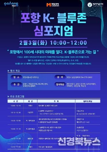 [신경북뉴스] 포항시는 내달 3일부터 시청 대회의실에서 ‘포항에서 100세 시대의 미래를 열다, K-블루존으로 가는 길’ 심포지엄을 개최한다.