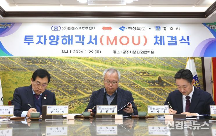 경주시는 29일 시청 대외협력실에서 경북도와 함께 자동차 차체 부품 전문기업 ㈜티에스오토모티브 간 전기차 신차종 제품 생산라인 구축을 위한 투자양해각서(MOU)를 체결했다.