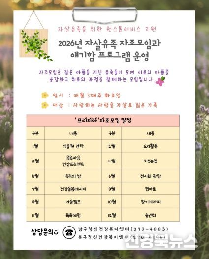 [신경북뉴스] 포항시 남·북구 보건소는 자살로 가족을 잃은 유족의 심리적 회복과 일상 복귀를 돕기 위해 ‘자살유족 원스톱 서비스’를 운영하고, 정서적 지지 강화를 위한 ‘유족 자조모임’을 지원하고 있다.