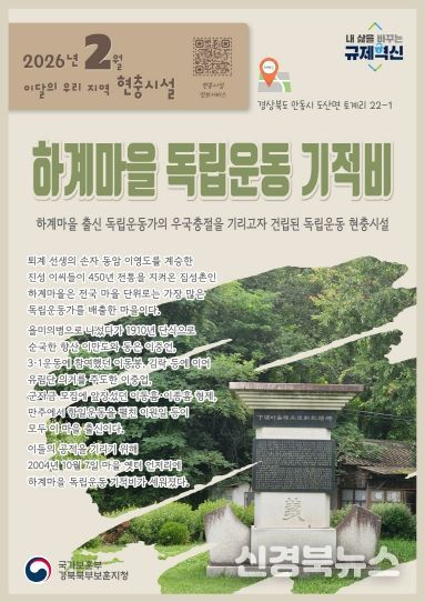 [신경북뉴스] 경북북부보훈지청은 2026년 2월 이달의 우리 지역 현충시설로 ‘하계마을 독립운동 기적비’(경상북도 안동시 도산면 토계리 22-1)를 선정했다.
