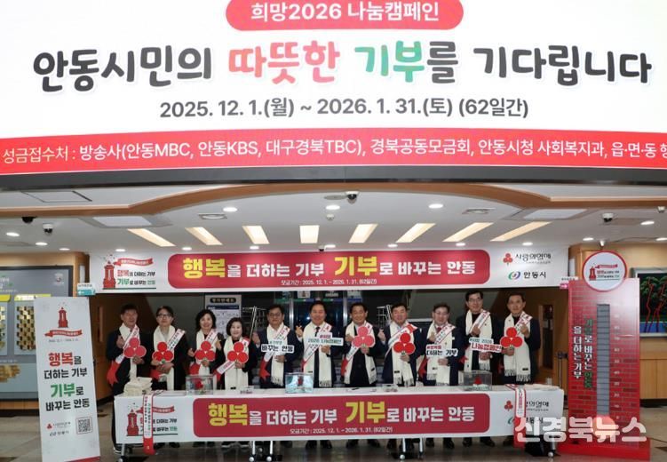 [신경북뉴스] 안동시가 ‘행복을 더하는 기부, 기부로 바꾸는 안동’이라는 슬로건으로 2025년 12월 1일부터 2026년 1월 31일까지 총 62일간 실시한 ‘희망2026 나눔캠페인’에서 9억 4천만 원을 모금하며 사랑의 온도 134℃를 기록했다.