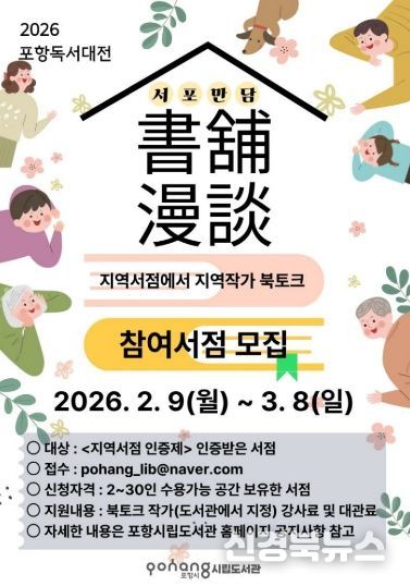 [신경북뉴스] 포항시는 오는 9일부터 내달 8일까지 ‘2026 포항독서대전’ 연간 프로그램인 ‘서포만담(書舖漫談)’에 참여할 지역 서점을 모집한다.