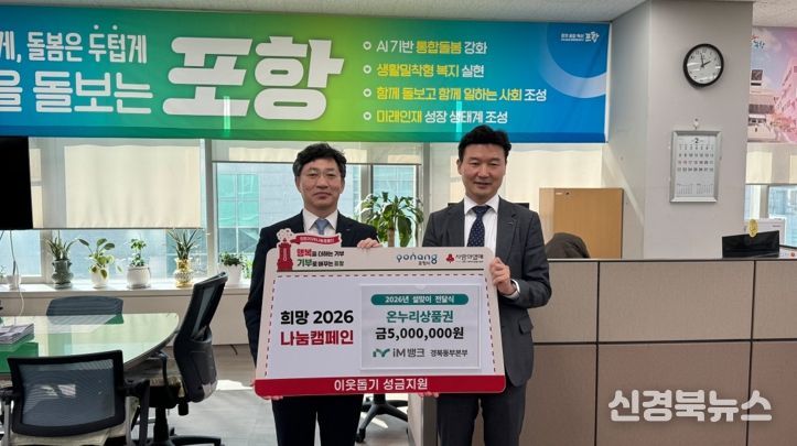 [신경북뉴스] iM뱅크 경북동부본부는 지난 6일 포항시청을 방문해 설 명절을 맞아 지역 내 취약계층 지원을 위한 500만 원 상당의 온누리상품권 전달식을 가졌다.
