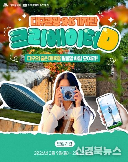 [신경북뉴스] 대구광역시와 대구문화예술진흥원은 대구 관광의 매력을 발굴하고, 확산할 대구관광 크리에이터D를 다가오는 22일까지 모집한다.