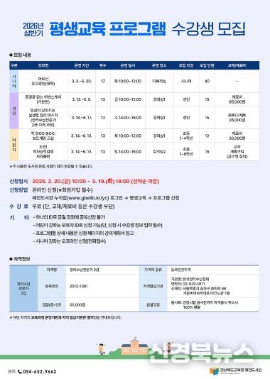[신경북뉴스] 경상북도교육청 예천도서관(관장 김미연)은 지역 주민의 평생학습 지원을 위해 2026년 상반기 평생교육 프로그램 수강생을 모집한다.