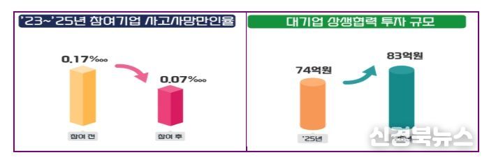 대기업과 정부의 지원을 받은 사업장은 안전한 일터로 거듭나고 있다. 지난 3년간 사업에 참여한 기업 10,453곳의 평균 사고사망만인율은 0.07‱로 참여 이전(0.17‱)보다 절반 이하로 감소했다.