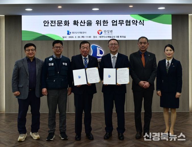 [신경북뉴스] 대구도시개발공사와 (사)대구안전생활실천시민연합이 2월 26일 본사 회의실에서 안전문화 확산을 위한 업무협약을 맺었다.