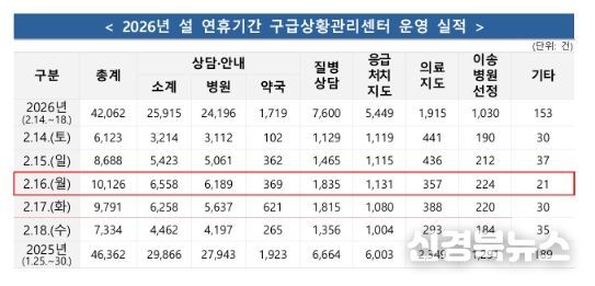 구급출동은 일 평균 9,016건, 환자 이송은 일 평균 4,833명으로, 전년 설 연휴 대비 각각 5.6%, 5.3% 증가했다. 2025년 설 연휴보다 하루 짧았음에도 응급의료 수요가 집중되면서 상담, 출동, 이송 모두 증가세를 보였다.