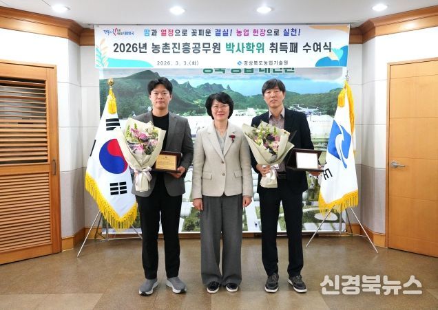 [신경북뉴스] 경북농업기술원은 3일 박사학위를 취득한 농촌진흥공무원 2명에게 취득패를 전달하며 연구 역량 강화를 독려했다.