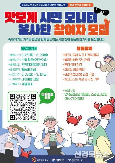[신경북뉴스] 영덕문화관광재단이 영덕대게축제 기간 동안 먹거리 환경의 청결과 신뢰성 확보를 위해 '맛보게 시민 모니터 봉사단'을 모집한다.