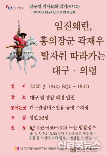 이번 행사는 대구문화예술진흥원 박물관운영본부 산하 대구향토역사관이 2026년 대구시민주간과 연계해 마련한 것으로, '임진왜란, 홍의장군 곽재우 발자취 따라가는 대구·의령'을 주제로 한다. 참가자들은 경남 의령군의 정암루, 의병박물관, 곽재우 장군 생가와 현고수, 그리고 대구 달성군의 곽재우 묘소와 예연서원 등지를 방문할 예정이다. 답사는 오전부터 오후까지 이어지며, 성인 33명을 선착순으로 모집한다. 신청은 3월 5일 오전 10시부터 전화로 가능하다.