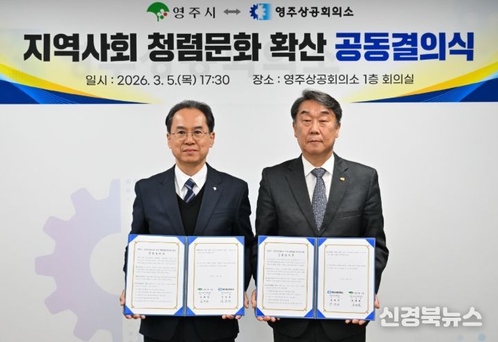 [신경북뉴스] 영주시는 지난 5일 영주상공회의소와 함께 '지역사회 청렴문화 확산 공동결의식'을 개최하고, 민·관이 함께 청렴 실천 의지를 다졌다.