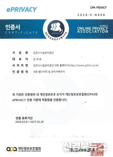 [신경북뉴스] 김천시시설관리공단(이사장 김재광)은 개인정보 보호 수준 향상과 안전한 정보관리 체계 구축을 위해 개인정보보호협회(OPA)가 주관하는 ‘ePRIVACY 인증’을 획득했다고 밝혔다.