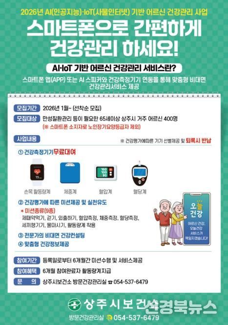 [신경북뉴스] 상주시보건소가 지역 내 65세 이상 어르신을 대상으로 비대면 건강관리서비스 참여자를 3월 말까지 선착순 모집한다.