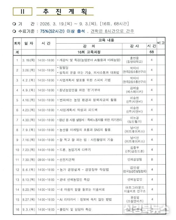 이 과정은 3월 19일 개강해 9월 3일까지 총 16회에 걸쳐 진행된다. 프로그램은 변화하는 농업 환경에 대응할 수 있도록 현장에서 필요한 실질적 지식과 기술을 제공하며, 청년농업인의 안정적인 농촌 정착을 지원하는 다양한 교육 내용이 포함된다.