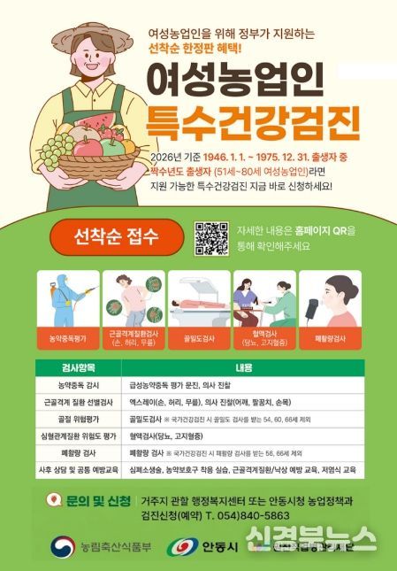 [신경북뉴스] 안동시가 여성농업인의 직업성 질환 예방과 건강관리를 위해 2026년 여성농업인 특수건강검진사업을 시작한다.