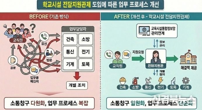 [신경북뉴스] 경북교육청은 학교 시설 업무의 전문성과 효율성을 높이고 현장 중심의 신속한 지원 체계를 구축하기 위해 3월부터 학교와 기술직 공무원을 1대 1로 매칭해 전담 지원하는 ‘학교 시설 전담지원관제’를 본격 시행한다고 20일 밝혔다.