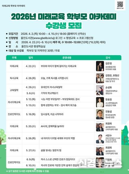 [신경북뉴스] 경상북도교육청 울진도서관이 4월 22일부터 6월 10일까지 매주 화요일과 수요일에 '미래교육 학부모 아카데미'를 진행한다.