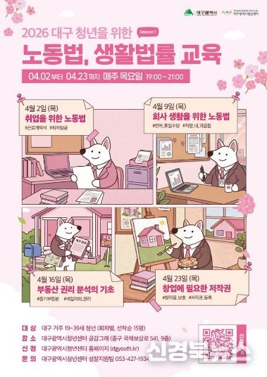 [신경북뉴스] 대구광역시는 지역 청년들의 노동권 보호와 법적 권리 인식 제고를 위해 ‘대구 청년을 위한 노동법·생활법률 교육’을 오는 4월부터 본격 추진한다.