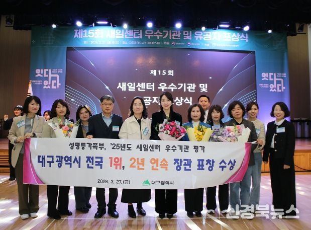 [신경북뉴스] 대구광역시는 성평등가족부가 주관한 ‘2025년 여성경제활동촉진 지원사업 평가’에서 전국 우수 지자체로 선정되는 쾌거를 이뤘다. 시는 지난 3월 27일(금) 서울 마포중앙도서관에서 열린 ‘2026년 새일센터 우수기관 및 유공자 포상식’에 참석해 우수기관 표창을 수상했다.