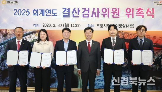[신경북뉴스] 포항시의회는 30일 오후 의장실에서 2025회계연도 결산검사위원으로 김형철·김상백 의원과 고가영·김광재·박민호·조영대 세무사를 위촉했다.