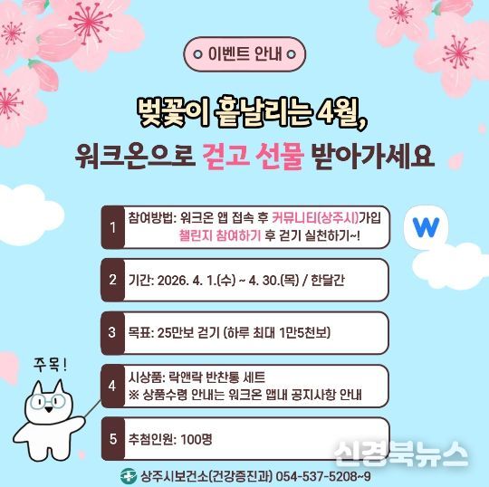 [신경북뉴스] 상주시보건소(소장 이건희)는 지역주민의 신체활동 증진과 건강한 생활습관 형성을 위해‘4월 건강걷기 챌린지’를 운영한다고 밝혔다.