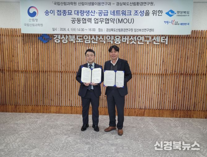 [신경북뉴스] 경상북도산림환경연구원은 임산식약용버섯연구센터에서 1일 산림청 국립산림과학원과 ‘송이 접종묘 대량생산·공급 네트워크 조성’을 위한 업무협약(MoU)을 체결했다.
