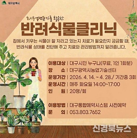 [신경북뉴스] 대구광역시농업기술센터는 도시농업 전문가를 활용해 오는 4월 14일부터 28일까지 매주 화요일, 총 3회에 걸쳐 ‘반려식물 클리닉’을 운영한다.
