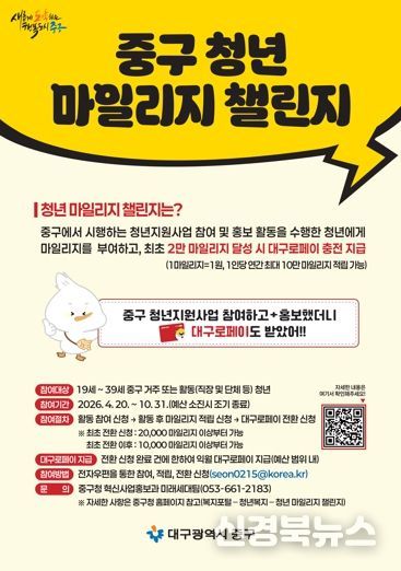 [신경북뉴스] 대구 중구는 청년들의 청년지원사업 참여를 확대하고 정책 인지도와 체감도를 높이기 위해 ‘청년 마일리지 챌린지’를 4월 20일부터 10월 31일까지 시행한다.