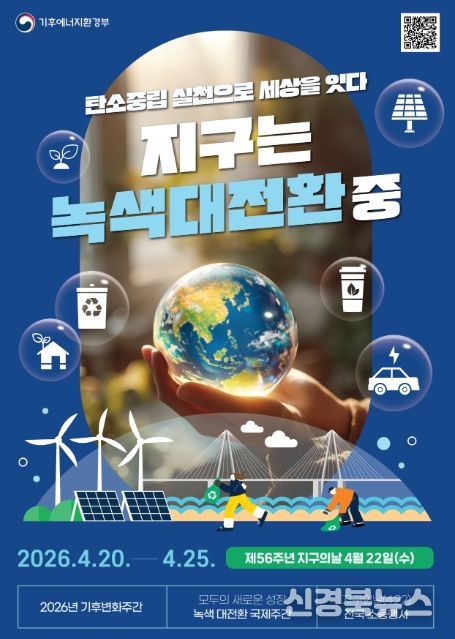 [신경북뉴스] 기후에너지환경부는 지구의 날(4월 22일)을 맞아 4월 20일부터 24일까지 ‘2026년 기후변화주간’을 개최한다. 올해 기후변화주간은 ‘녹색대전환 국제주간(4.20~4.25)’과 연계되어 국제사회의 탄소중립 기술과 정책, 국민의 일상 속 기후행동 실천이 함께 어우러지는 탄소중립 실천문화 확산을 위한 참여와 공감의 장이 마련될 전망이다.