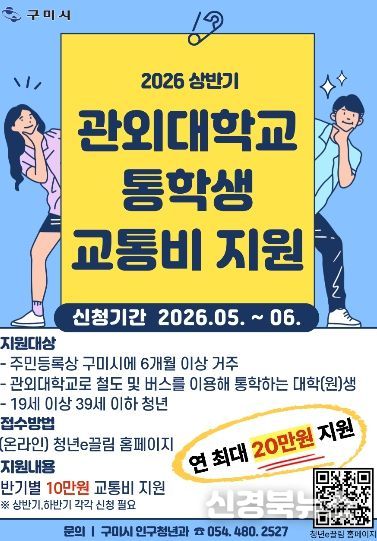 [신경북뉴스] 구미시가 관외 대학(원)생의 통학 부담을 줄이기 위해 교통비 지원 방식을 대폭 손질했다. 실비 정산을 폐지하고 연 최대 20만원 정액 지원으로 전환하는 한편, 증빙 절차를 간소화해 청년 체감도를 높인 것이 핵심이다.