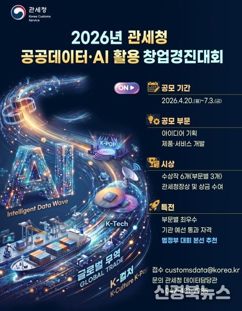 [신경북뉴스] 관세청은 공공데이터로 개방된 관세무역데이터에 인공지능 기술을 활용한 혁신적인 창업아이디어를 발굴·지원하기 위해 4월 20일부터 '2026년 관세청 공공데이터·인공지능(AI) 활용 창업경진대회'를 개최한다.