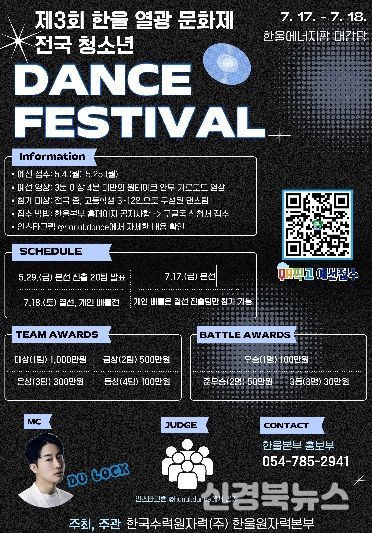 [신경북뉴스] 한국수력원자력(주) 한울원자력본부는 7월 17일, 18일 개최 예정인 제3회 한울 열광 문화제 ‘전국 청소년 댄스 페스티벌’ 예선 접수를 5월 4일부터 5월 25일까지 진행한다.
