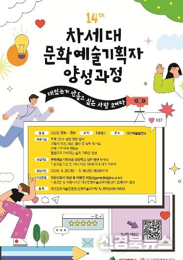 [신경북뉴스] 대구문화예술진흥원 문화예술본부는 대구 지역 자원을 기반으로 문화예술 생태계를 이끌어갈 인재를 양성하기 위한 ‘2026 차세대 문화예술기획자 양성 과정’ 교육생을 모집한다.