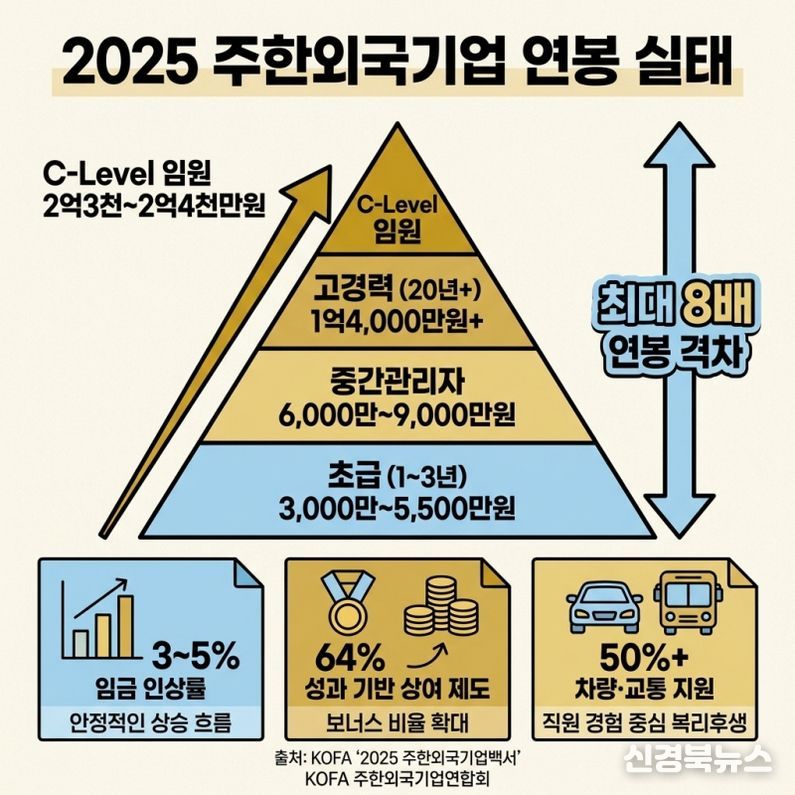 [신경북뉴스] 주한외국기업연합회(상임대표 김종철, KOFA)는 ‘2025 주한외국기업백서’ 혁신판을 발표하고, 작년 6월 실시한 주한외국기업 급여 및 상여금 실태조사와 함께 복리후생 조사 결과를 포함해 공개했다. 이번 백서는 7년째 발간되는 자료로, 기존 조사 대비 한층 고도화된 분석 체계를 적용해 글로벌 전문 조사기관 수준의 HR 리포트로 업그레이드됐다는 평가를 받고 있다.