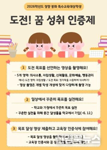 [신경북뉴스] 봉화교육지원청은 4월 20일 '장애인의 날'을 기념하여, 경상북도 내 최초로 특수교육대상학생의 특성을 반영해 전면 개편한 2026학년도 정향 봉화 특수교육대상학생 '도전! 꿈 성취 인증제' 참가 신청을 받고 본격적인 운영에 돌입한다고 밝혔다.