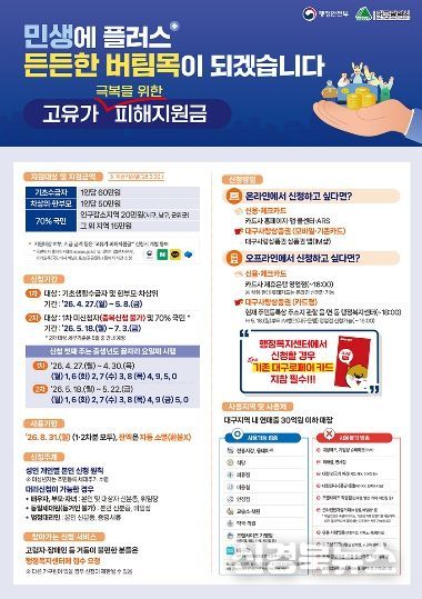 김정기 대구광역시장 권한대행 행정부시장은 “중동전쟁으로 인한 고유가·고물가로 지역경제 소비심리가 크게 위축됐다”며 “민생 안정이 최우선인 만큼, 시민분들께서 신청 단계부터 지급·사용까지 불편함이 없도록 만반의 준비를 다하겠다”고 말했다.