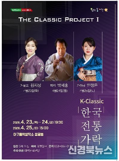 [신경북뉴스] 대구 남구 대덕문화전당이 순수예술 활성화를 위해 지난해 신설한 ‘The Classic Project’의 2026년 상반기 시리즈가 세계적으로 각광받고 있는 국악의 매력을 소개하는 무대들로 오는 4월 23일부터 4월 25일까지 사흘간 대구음악창작소 창공홀에서 펼쳐진다.