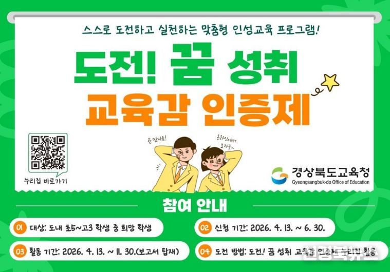 도전! 꿈 성취 교육감 인증제 10개 프로그램에는 △책 쓰는 아이들 △우리 땅 독도 지킴이 △도전! 문해력을 높여라 △탄소중립! 100일의 도전 △트레킹, 경북 속으로 △꿈다락(꿈多樂) 챌린지 △English! Speak Up △청소년 CEO 창업프로젝트 △창의융합에듀파크 스탬프 투어 등이 있다.