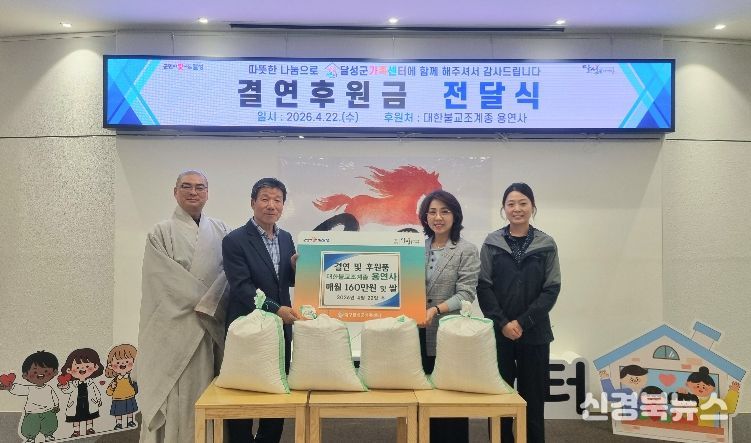 [신경북뉴스] 달성군가족센터(센터장 방승희)는 지난 22일 센터 내에서 대한불교조계종 용연사(주지 능도 스님)와 함께 ‘취약·위기 다문화가정 결연금 전달식’을 가졌다고 밝혔다. 이번 사업은 경제적 고통과 위기 상황에 놓인 관내 저소득 다문화 8가구를 돕기 위해 기획됐다.