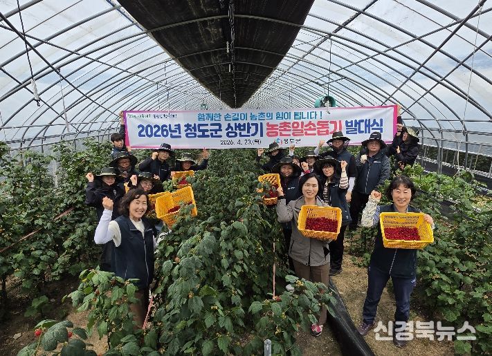 [신경북뉴스] 청도군은 농촌인구 감소와 고령화로 일손 부족을 겪고 있는 농가를 지원하기 위해 4월 23일 운문면 방지리 산딸기 농장에서 발대식을 개최하고, 농가의 산딸기 전정 및 수확 작업을 도우며 2026년 상반기 농촌일손돕기의 힘찬 시작을 알렸다.