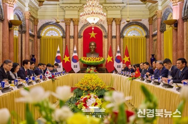 [신경북뉴스] 베트남을 국빈 방문 중인 이재명 대통령은 22일(현지시간) 오후 베트남 국가주석궁에서 또 럼 당서기장 겸 국가주석과 정상회담을 갖고, 양국 간 포괄적 전략 동반자 관계 발전 방안과 지역·국제 정세 등에 대해 심도 있게 논의했다고 이규연 청와대 홍보소통수석이 서면 브리핑했다.