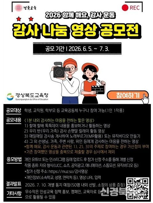 [신경북뉴스] 경북교육청은 학생과 학부모, 교직원 등 교육공동체가 함께 감사의 마음을 나누는 문화를 확산하기 위해 ‘감사 나눔 영상 공모전’을 개최한다고 24일 밝혔다.