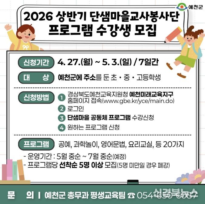[신경북뉴스] 예천군은 4월 27일부터 5월 3일까지 2026년 상반기 단샘마을교사봉사단 프로그램 수강생을 모집한다.