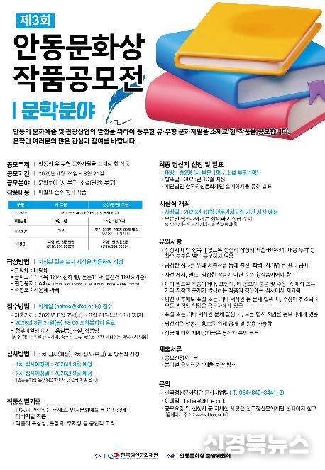 [신경북뉴스] 재단법인 한국정신문화재단과 안동문화상 운영위원회는 안동의 유․무형 문화자원을 예술적으로 재조명하고 지역문화의 우수성을 국내외에 알리기 위해 ‘제3회 안동문화상 작품공모전’을 개최한다.