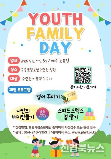 [신경북뉴스] 포항시청소년재단 구룡포청소년수련원은 5월 가정의 달을 맞아 청소년과 가족이 함께 참여하는 체험형 프로그램 ‘2026년 5월 YOUTH FAMILY DAY’를 운영한다.